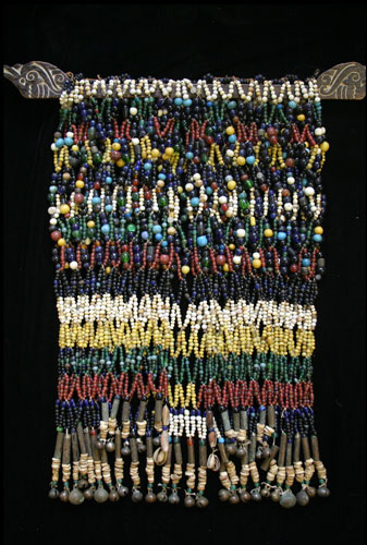 This rare bead blouse is from the Iban tribe of Sarawak. Old glass beads, brass tubular beads, cowrie shell, sea shell. David got this from Nelson Tan in Kuching in 2000 27x18" $3500 |