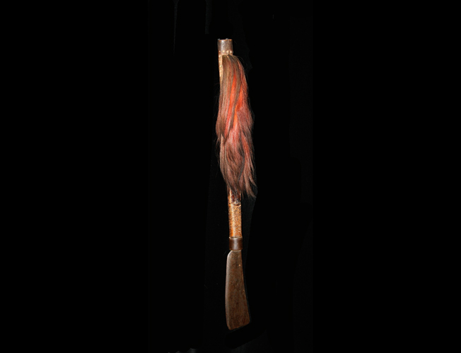 | Naga dao. Early/mid 20th. Iron, wood, rattan, goat hair. Both cutting tool and weapon. Obtained via eBay in 2001 with the following description - "From an old European tea plantation owner's estate, comes this Naga Peoples (Konyak Group) Head Hunting DAO Sword, circa early 1900's, with authentic and colorful attached red and black goat hair. Measurements: 29" in length with an 8" long blade . Old forged blade exhibiting fine old patina. Shaft still retains virtually all of the fine old cane yellow wrap." |