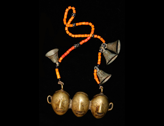 | Naga warrior brass chest ornament indicating number of heads taken. Mid 20th. Cast bronze, glass beads. Obtained from Himalayan Antiques via Internet in 2001 |