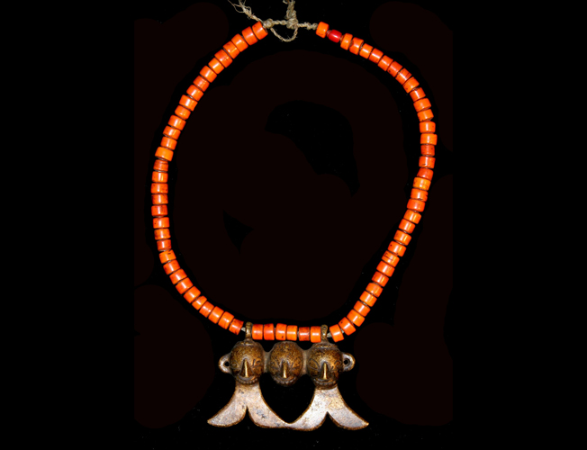 | Naga necklace. Mid 20th. Glass beads, cast bronze heads signifying number of heads taken by wearer. Obtained in Wakching village in 2003 |
