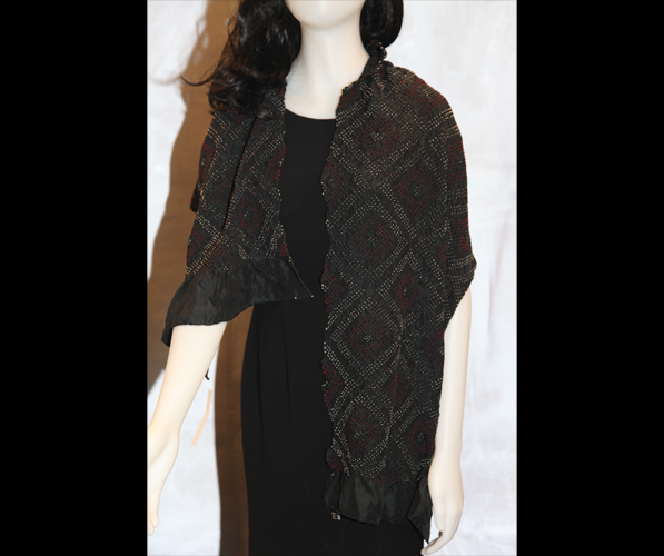 Bandhani tie and dye silk stole. Black. White and red dots, geometric pattern