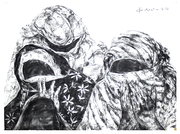 22.5'' x 15'' - charcoal on paper 1st September 2012: Locals, activists attack the rescue-home manager. Four inmates were kidnapped from a rescue-home at Sharada Nagar. The rescue-home is run by the Ministry for Women’s Welfare and Child Development with the help of an NGO. Two other attempted kidnappings had taken place in the four months prior, one on the 24th of June 2012. The NGO running Ujjawala Rescue Home insinuated that Women’s Welfare and Child Development authorities have not disbursed funds for almost two years. This is about a rescue home in Hyderabad with a name 'Ujjwala', where women are rescued from flesh trade, bonded labor, etc., run by NGOs and funded by Govt. Ujjawala is a Sanskrit term, which means, in this context, "The Home that Spreads light" |